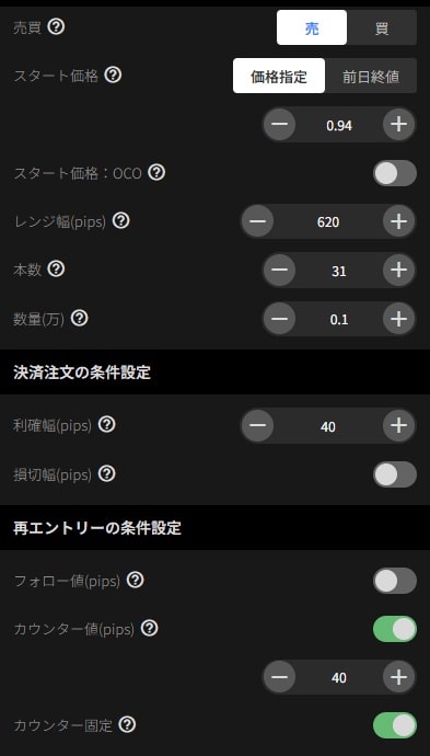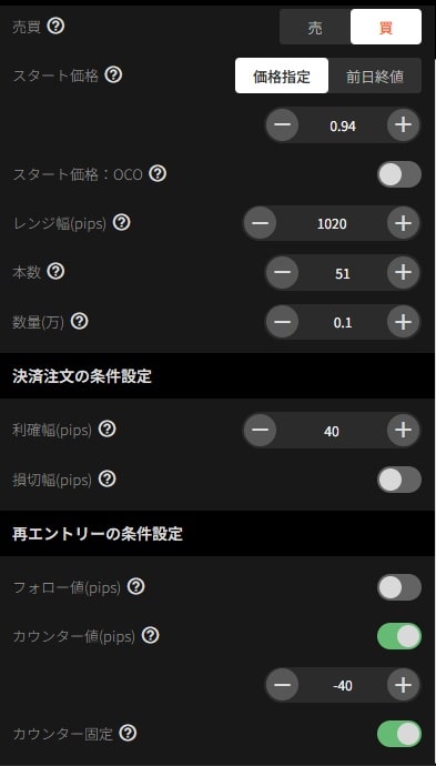 これは1,000通貨(0.1万)だと「0.4カナダドル」の利益金額を狙う設定になります。