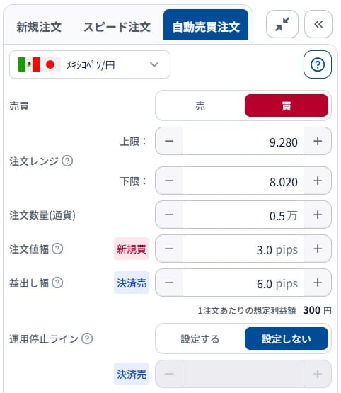 松井証券のFX自動売買でメキシコペソ/円、5,000通貨20万円設定!