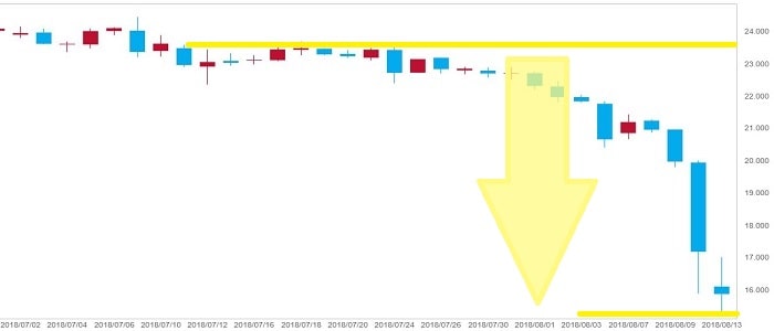 たった2か月で、トルコリラ/円の値(レート)は23円台から15円台まで急落!